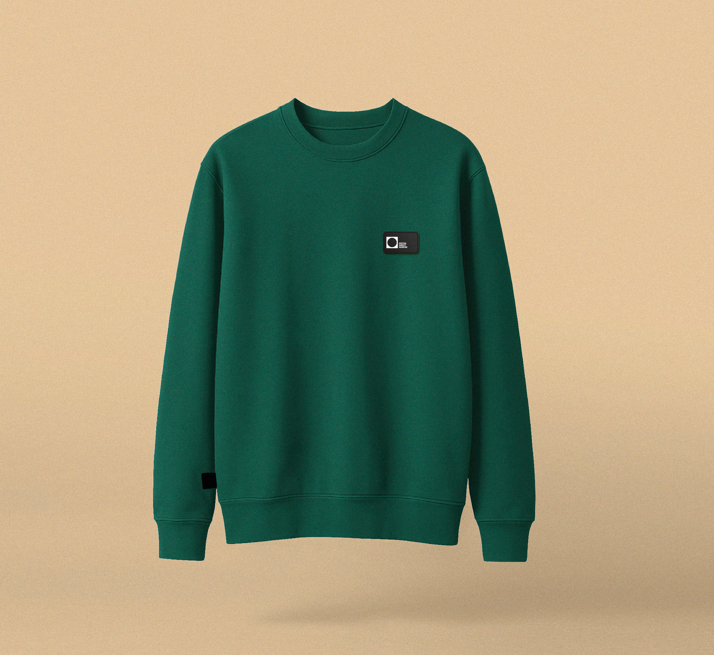Descripción: Jersey de color verde oscuro. Forma normal. Cuello redondo. Manga montada.1×1 de ribete al cuello, muñeca y abajo. Refuerzo con la misma tela en la espalda. Un parche de goma cosida en el corazón, de un solo color. Composición: Felpa perchada, 85% algodón orgánico peinado y 15% poliéster reciclado. Tela limpia. Peso: 280 GSM