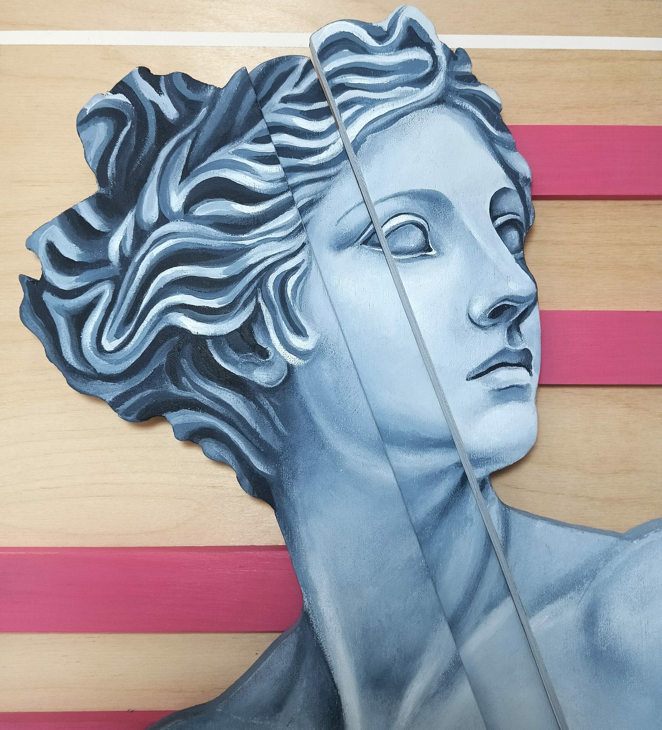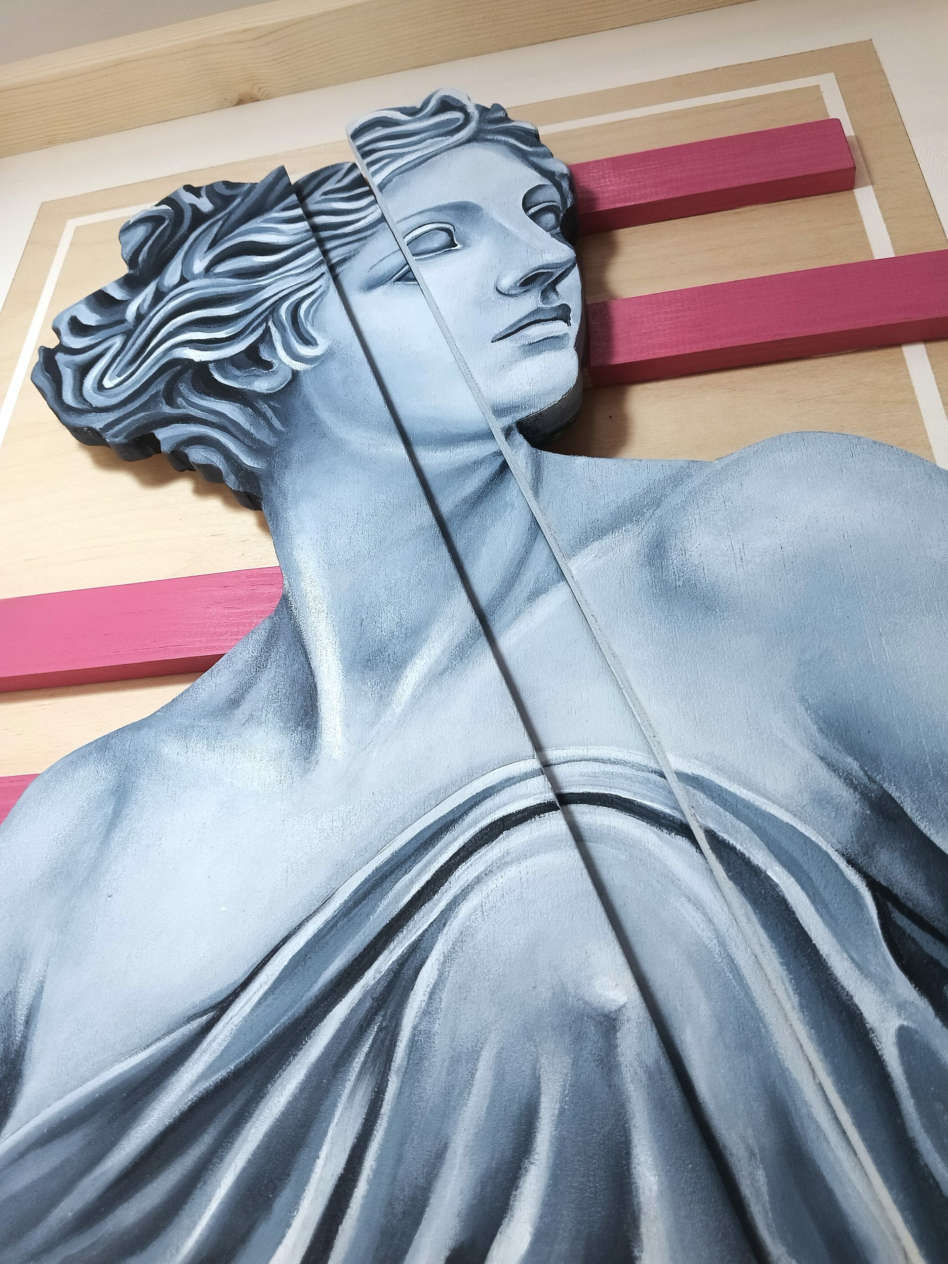 La pieza se compone de madera cortada a mano y policromada. Los planos de la figura poseen una tridimensionalidad reales, donde el volumen pictórico del claroscuro se ve alterado por el relieve escultórico.